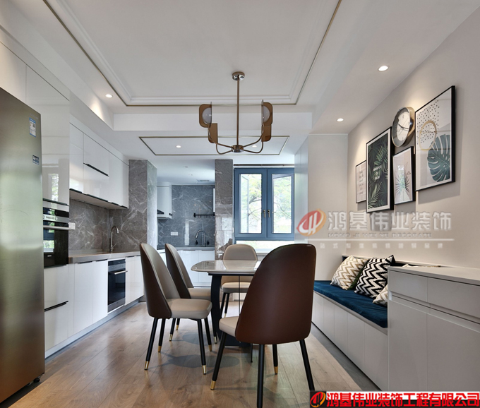 廚房和西廚的區(qū)域,空間不是很大,但是功能很強(qiáng),西廚有設(shè)計(jì)烤箱、洗碗機(jī)、冰箱、操作臺(tái),在吃飯之前洗個(gè)手,切個(gè)水果很方便。餐廳的卡座是定制的,因?yàn)椴蛷d的寬度不夠 所以設(shè)計(jì)了卡座來(lái)節(jié)約餐廳的空間,減少過(guò)道區(qū)域。