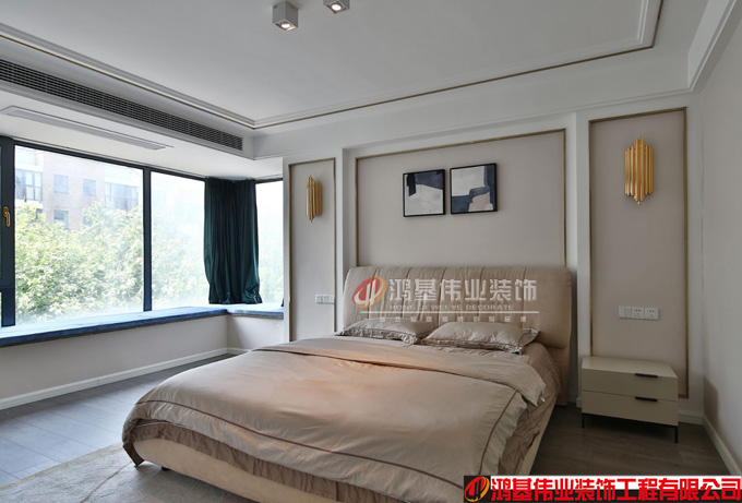 主臥室的頂也是原頂,四周吊了一個(gè)邊,鑲嵌了拉絲不銹鋼,床頭背景墻是石膏板做的,刷的實(shí)有色乳膠漆,邊是用了不銹鋼來(lái)收口。